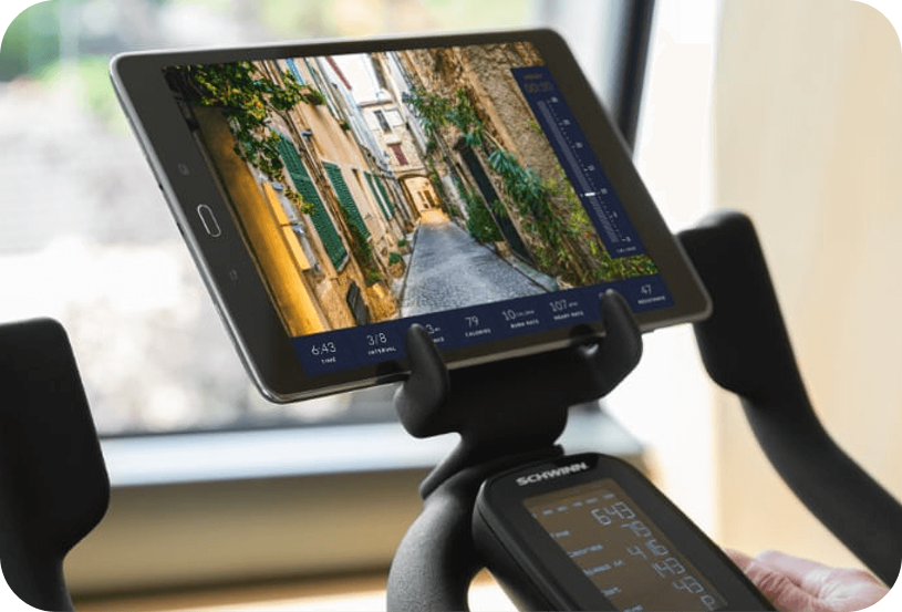 A Bike Spinning 800IC Schwinn também tem suporte integrado de tablet/smartphone para mais imersão no seu treino.